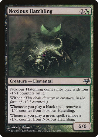 Noxious Hatchling enters the battlefield with four -1/-1 counters on it. Wither (This deals damage to creatures in the form of -1/-1 counters.) Whenever you cast a black spell, remove a -1/-1 counter from Noxious Hatchling. Whenever you cast a green spell, remove a -1/-1 counter from Noxious Hatchling.